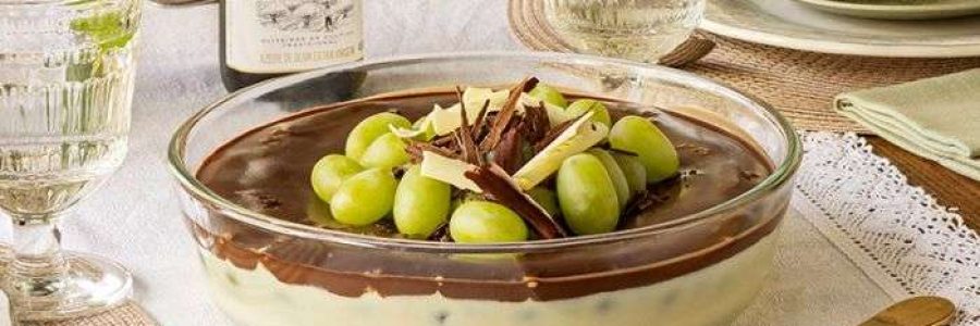 6. Em um refratário, espalhe o creme branco no fundo, cubra com as uvas e finalize despejando a ganache de chocolate por cima.